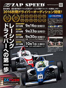 公式選手権レースで最多勝利数、最多タイトル獲得数を誇るZAP SPEEDのオーディションが開催される。 2015年度スーパーフォーミュラチャンピオンの石浦宏明選手もこのオーディションがフォーミュラの第一歩でした。