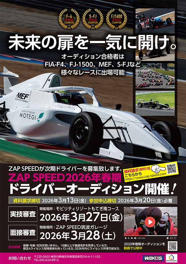 これまで多くのプロドライバーを生み出して来たZAP SPEEDドライバーズオーディションは頂点を目指すドライバーの最初の一歩。
