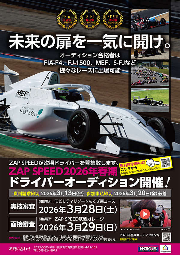 これまで多くのプロドライバーを生み出して来たZAP SPEEDドライバーズオーディションは頂点を目指すドライバーの最初の一歩。